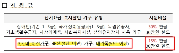 3자녀 이상가구, 출산(3년 미만) 가구, 대가족(5인 이상): 15% 환급, 30만 원 한도