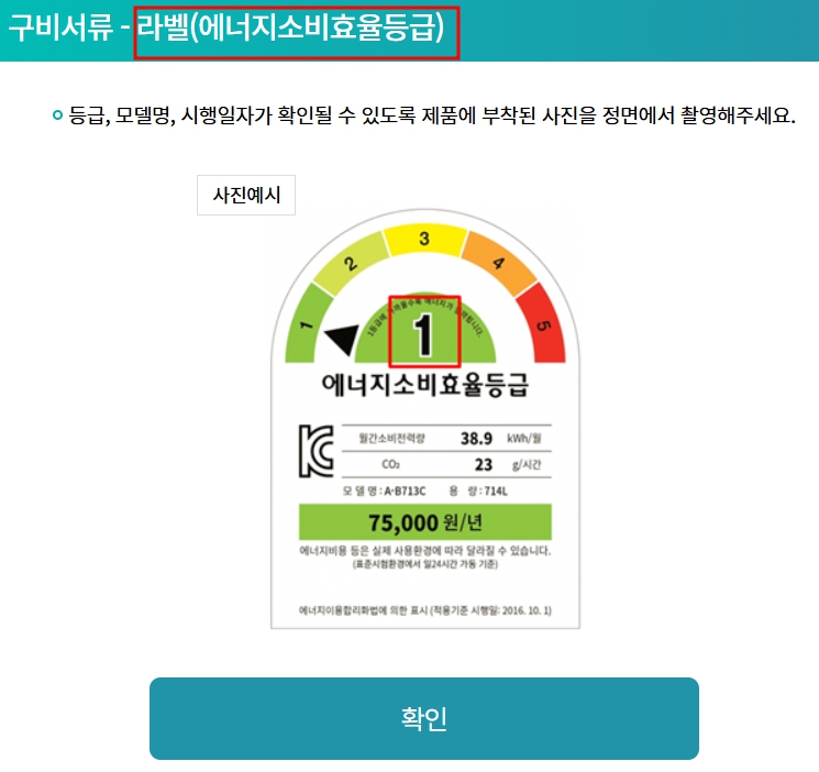 5. 효율등급 라벨 사진 (모델명, 등급, 적용기준, 시행일자 확인 가능해야 함)