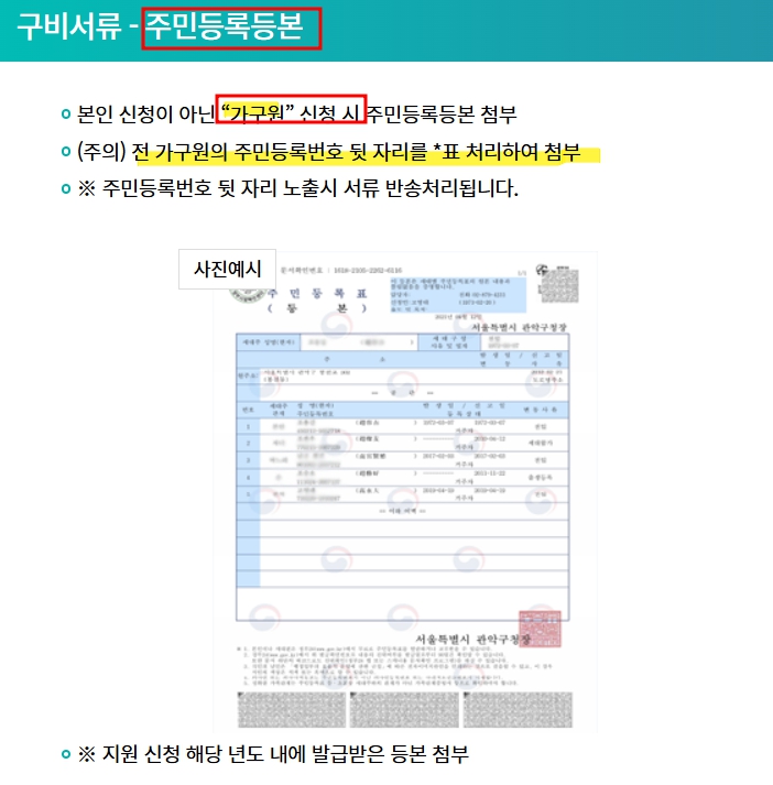 전 가구원의 주민등록번호 뒷자리를 *표 처리하여 첨부해야지 서류 반송처리 되지 않는 점