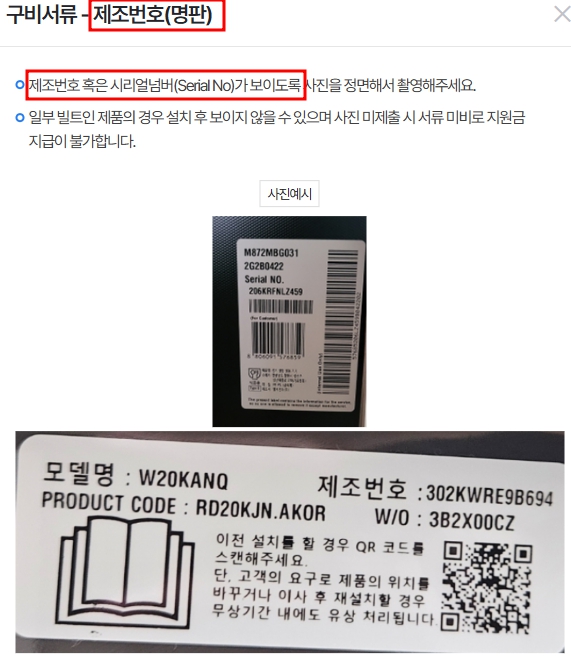 3. 구매 기기에 부착된 명판(모델명 및 제조번호 포함) 사진