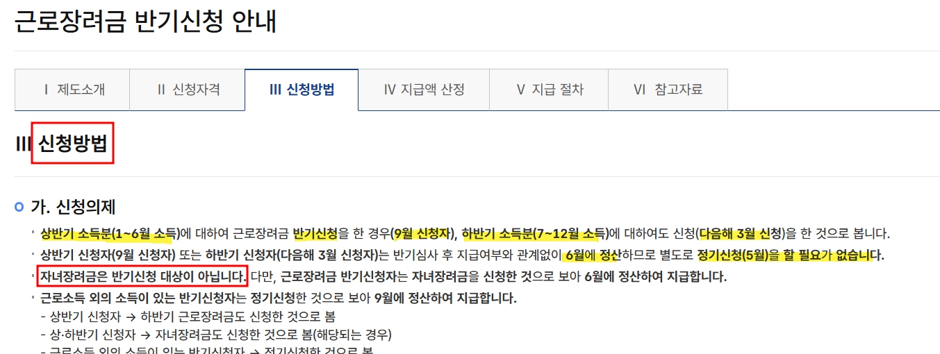 그러나 자녀장려금의 경우, 정기신청 시 함께 신청해야 하므로 반기 신청을 통해