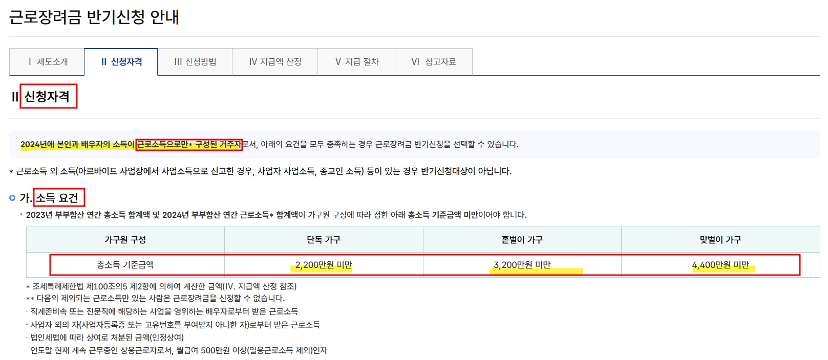 2024년 기준으로 근로소득만을 기준으로 한 소득요건은 다음과 같습니다.