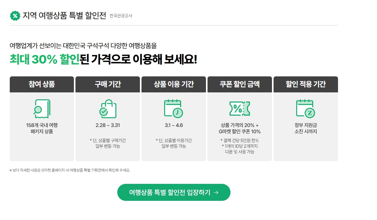 국내 여행 패키지 최대 30% 할인 (158개 여행상품 포함)