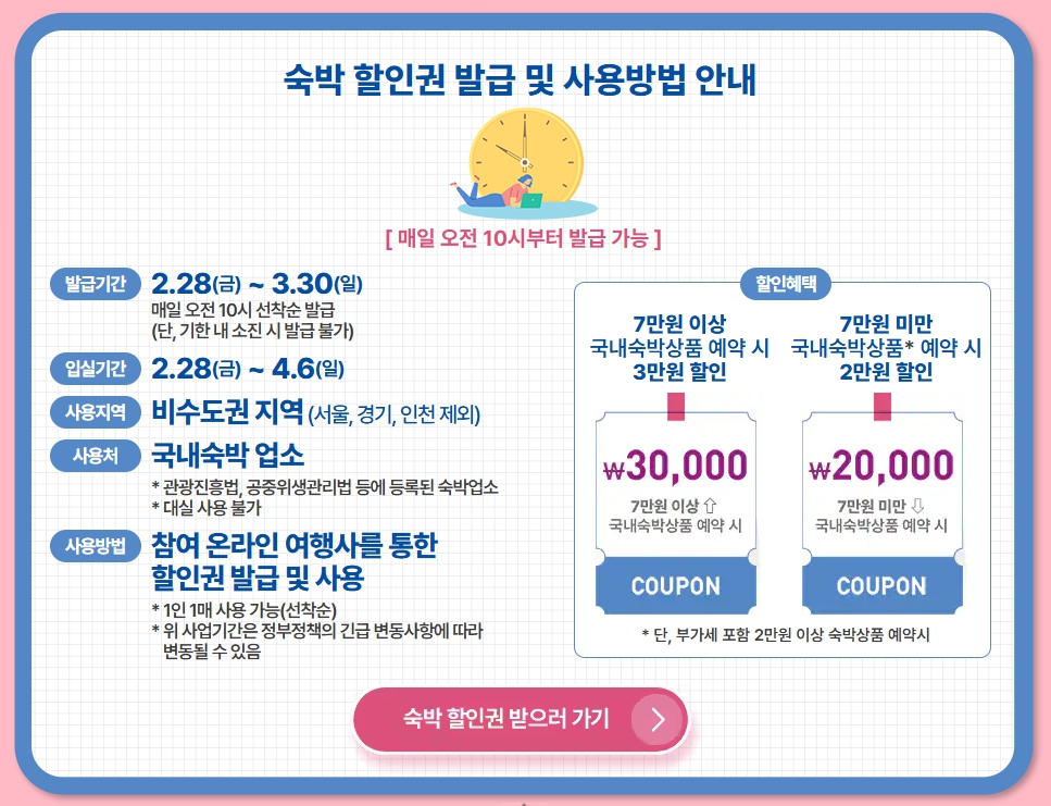 이번 숙박 할인권은 총 100만 장이 배포될 예정이며, 1차로 30만 장이 2월 28일부터 제공됩니다.