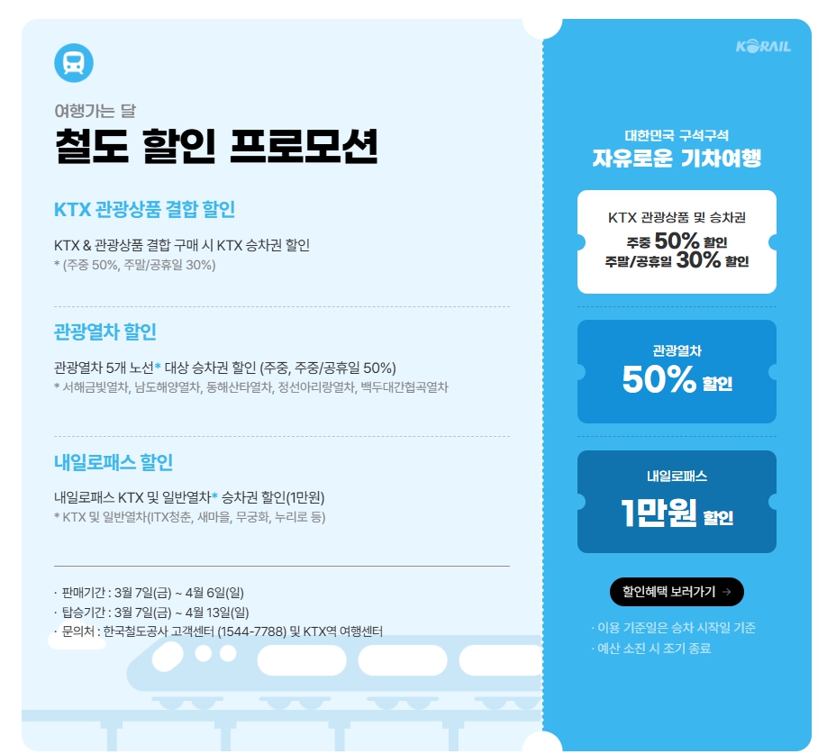 KTX와 관광열차 할인, 렌터카 반값 혜택을 활용하면 더욱 저렴하게 여행을 즐길 수 있습니다.