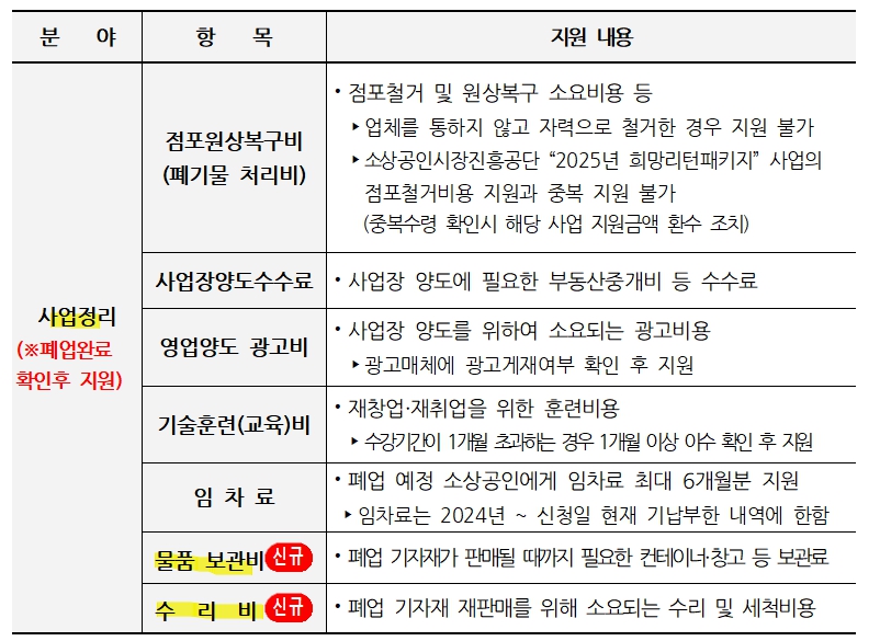 임차료: 폐업 예정 소상공인 대상 최대 6개월 지원
