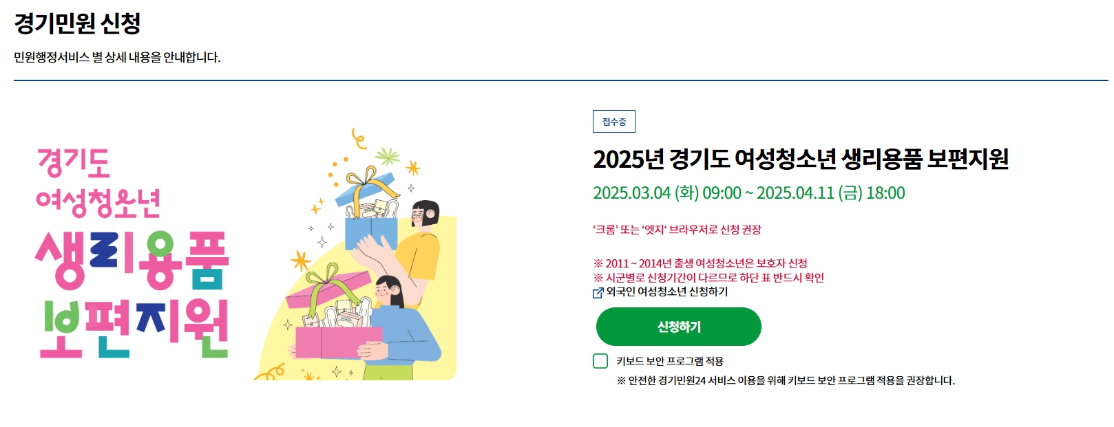 한 번 신청하면 최대 24세까지 혜택을 받을 수 있으며, 월 1만 4천 원의 생리용품 구입 비용이 제공됩니다.