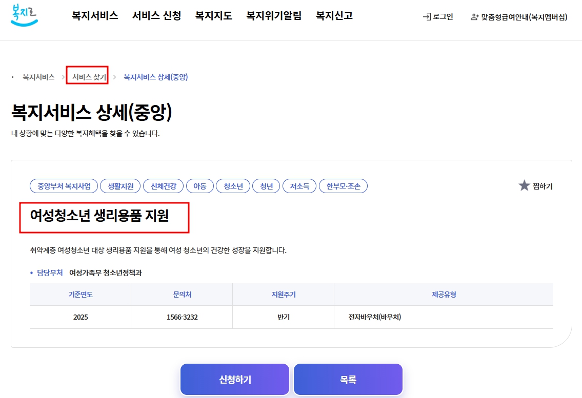 로그인 후 ‘여성청소년 생리대 바우처 신청’ 메뉴 선택