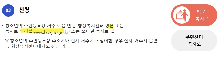 신청 장소: 청소년 본인 또는 부모 등 보호자가 읍·면·동 행정복지센터 방문하여 신청