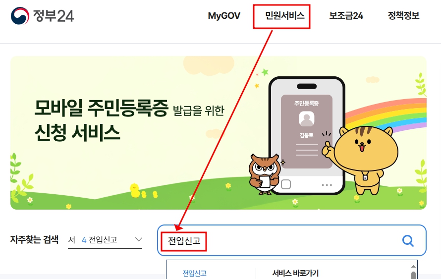 민원 24 또는 정부 24 홈페이지에서 공인인증서를 통해 본인 인증 후 전입신고를 할 수 있습니다.
