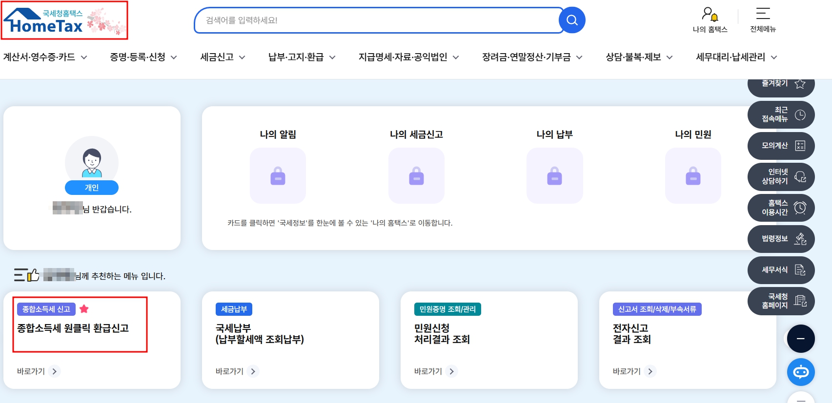 첫 화면에서 ‘원클릭 환급신고’ 버튼이 보일 거예요.