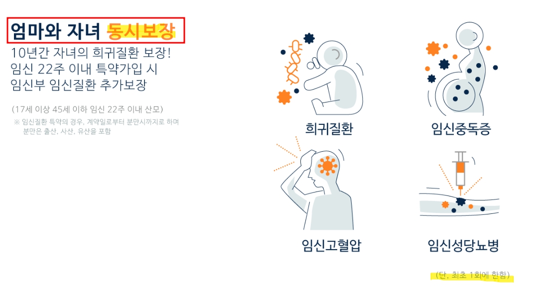 또 아기 건강도 신경 써야 하니까 두 사람 모두를 한 번에 보장해 주는 보험이 꼭 필요해요.