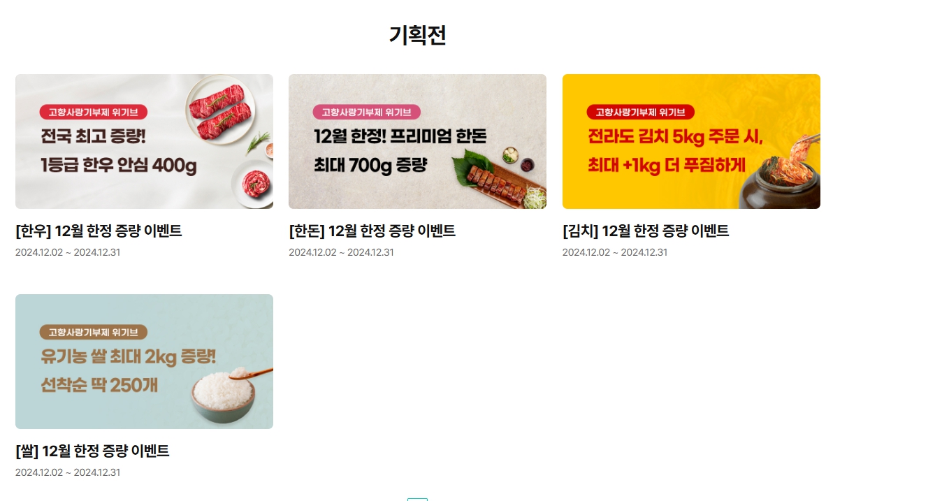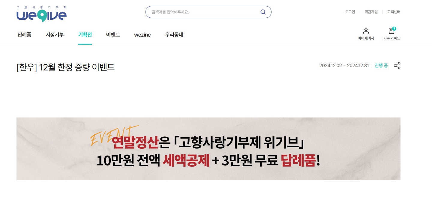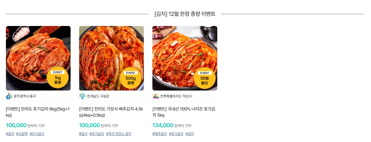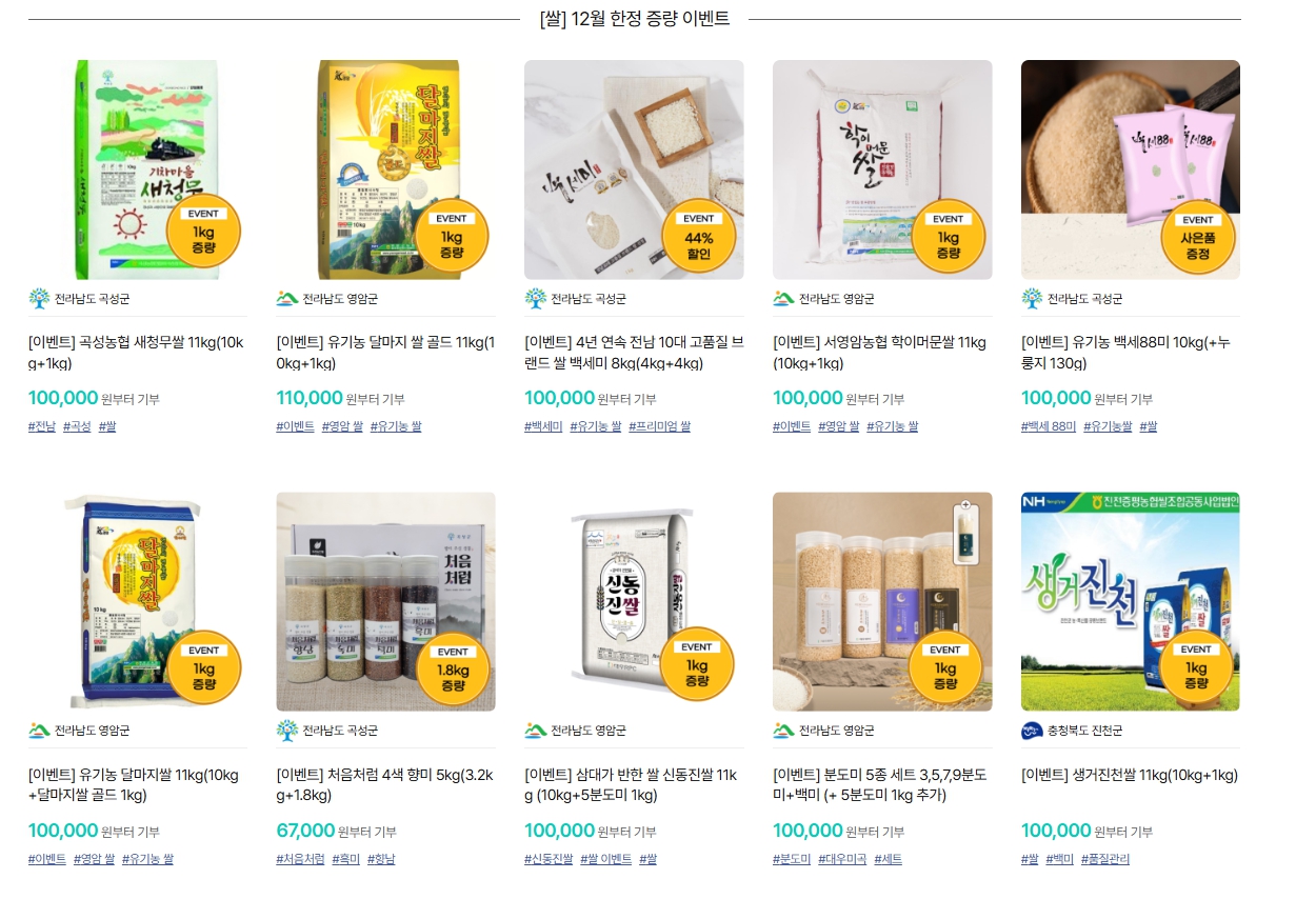 한우, 한돈, 김치, 쌀 등을 위기브에서 기부하면 12월 한정 증량 이벤트가 진행되고 있습니다