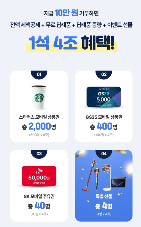 전액 세액공제 + 무료 답례품 + 답례품 증량 + 이벤트 선물까지