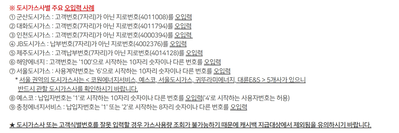 고객식별번호를 잘못 입력할 경우 가스 사용량 조회가 불가능하기 때문에 캐시백 지급 대상에서 제외될 수 있으니 꼭 확인해 보시길 바랍니다