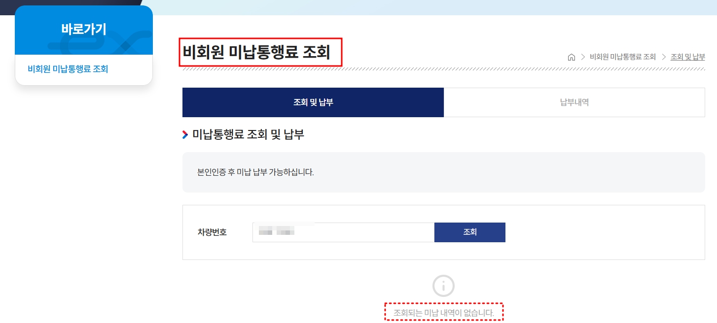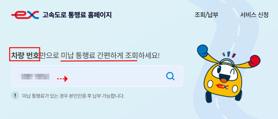 차량번호를 입력하면 해당 차량의 미납된 통행료 내역을 확인할 수 있습니다.