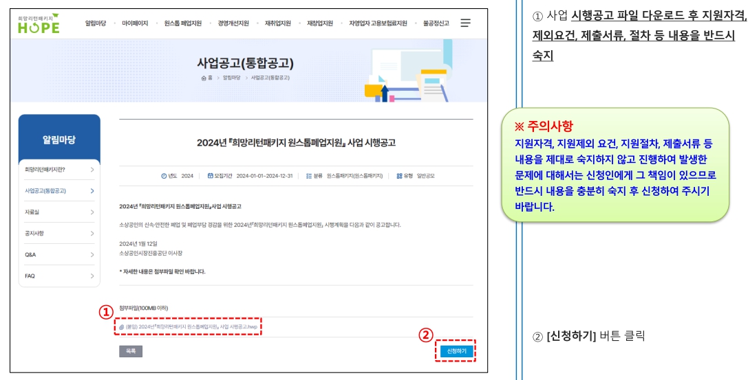 > 사업시행공고 > 시행공고 파일 다운로드 후 지원자격, 제외요건, 제출서류 절차 등 내용을