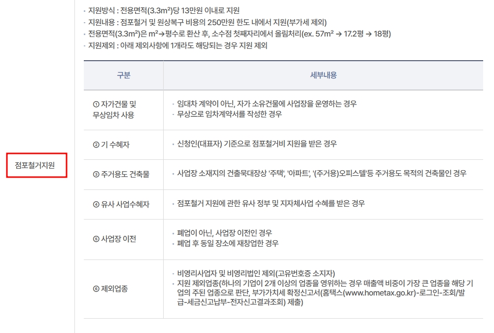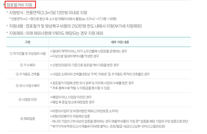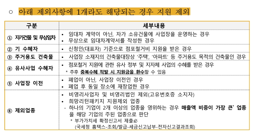 하지만 위의 사항 중 1개라도 해당되는 경우에는 소상공인 철거지원금 대상에서 제외됩니다