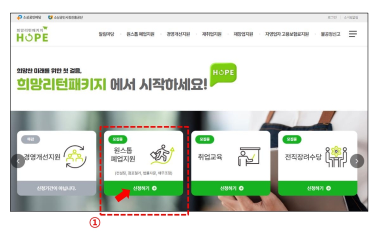 > 희망리턴패키지 접속 > 원스톱폐업지원 클릭