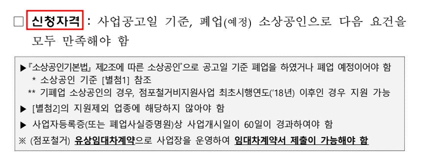 1) 소상공인기본법에 따른 소상공인으로, 기폐업(이 경우, 2018년 이후) 이거나 폐업 예정이어야 함