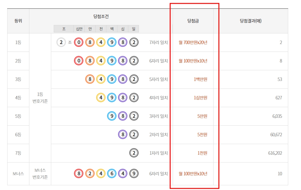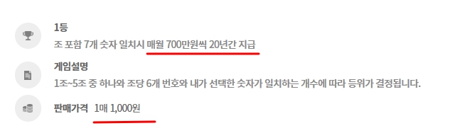1등 당첨금: 월 700만 원(20년간 지급, 총 16억 8천만 원)
