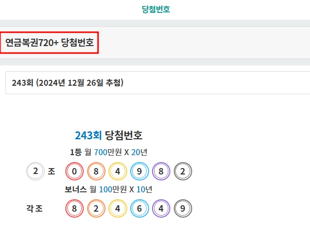최근의 당첨번호를 살펴보면, 243회 차의 당첨번호는 0, 8, 4 ,9, 8, 2로,