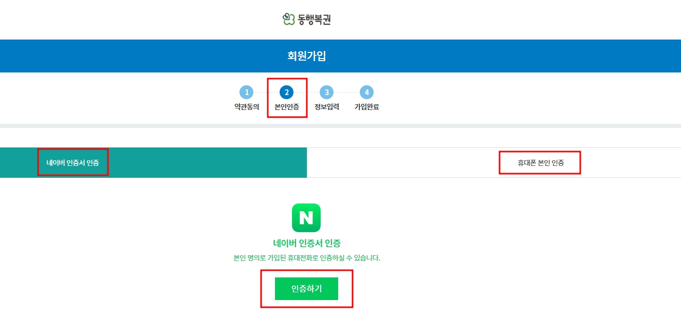 > 본인 인증 방법에는 네이버인증서 및 휴대폰본인인증 방법이 있습니다