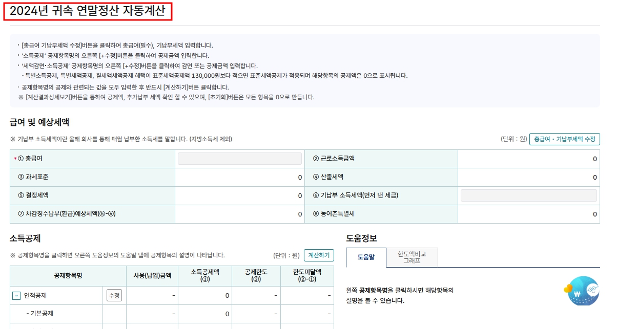 이 서비스는 근로자가 한 해 동안 예상되는 소득과 공제 항목을 입력하여, 대략적인 환급액 또는 추가 납부액을 미리 계산해 볼 수 있도록 합니다.