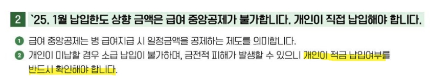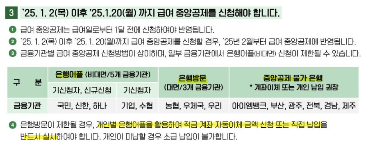25년 1월 2일 이후 1월 20일까지 급여 중앙공제를 신청해야 합니다.