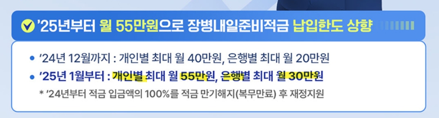 2025년부터 병사들의 재정적 자립과 미래 준비를 지원하기 위한 장병내일준비 적금의 납입한도가 상향됩니다.