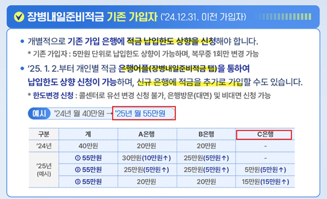 1) 기존 가입자: 납입한도 상향이 가능하므로, 복무 기간 중 여유 자금이 발생할 경우 최대한도로 변경하는 것이 유리합니다.