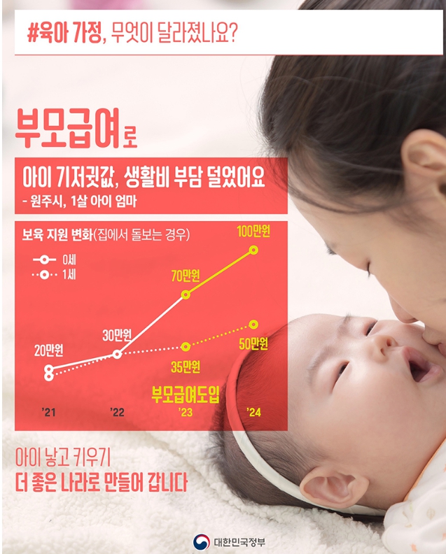 부모급여는 정부의 출산·육아 지원 정책으로 부모들의 경제적 부담을 덜어주고, 아이의 건강한 성장과 양육을 지원하는 중요한 역할을 하고 있습니다.