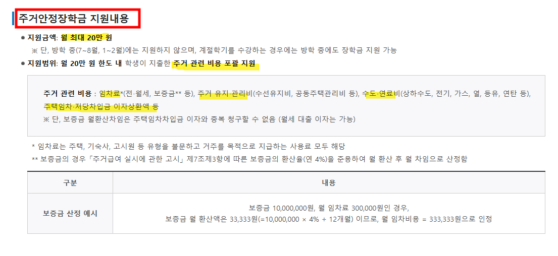 이 장학금은 대학생들이 주거비 부담을 덜고 학업에 집중할 수 있도록 돕는 중요한 재정 지원 제도입니다.