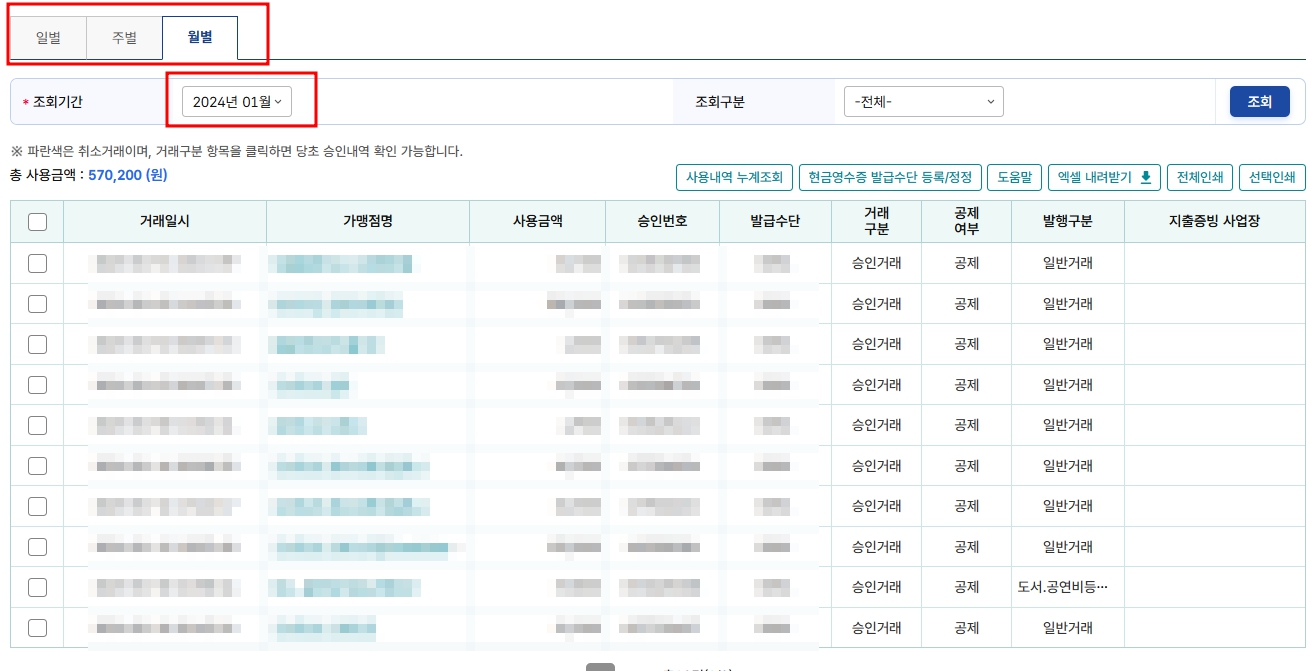 일별, 주별, 월별 자세히 현금영수증 조회가 가능합니다.