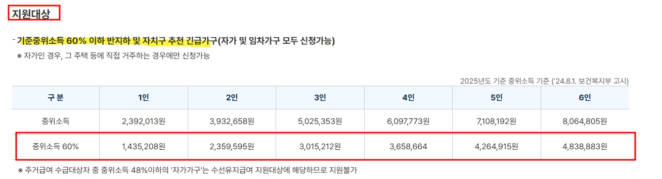 중위소득은 국민 가구 소득의 중윗값을 기준으로, 이를 60% 이하로 설정한 가구가 신청 대상입니다.