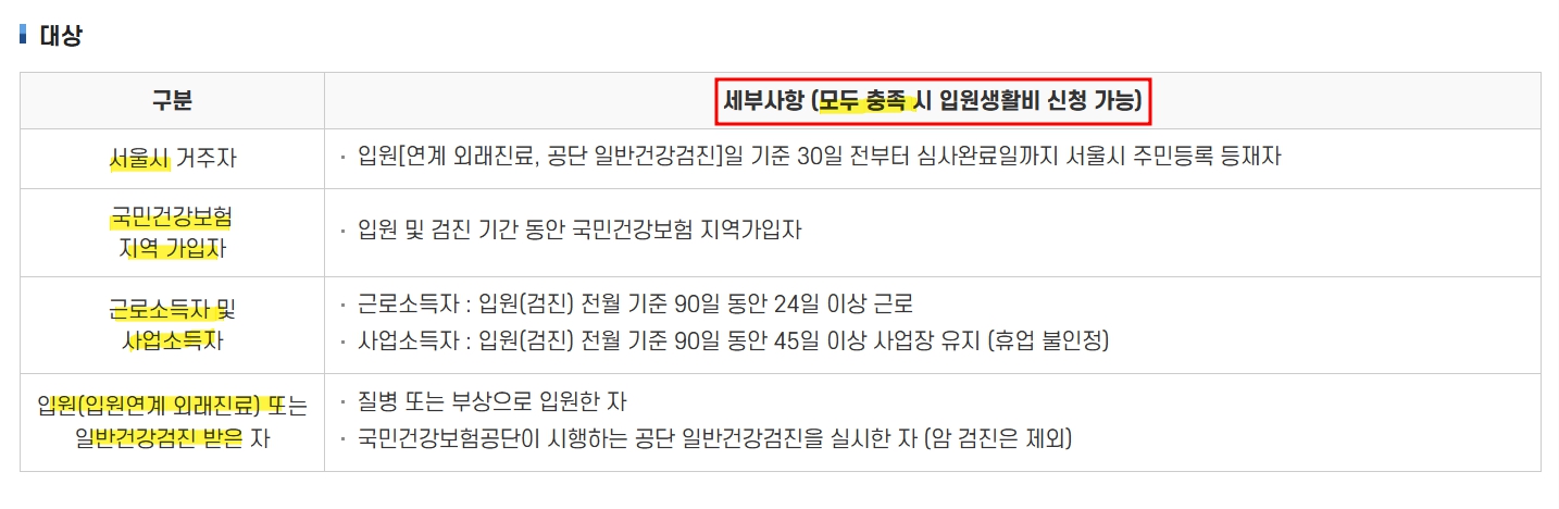 서울형 입원 생활비 지원은 서울시에 거주하는 시민 중에서, 아래의 조건을 만족하는 사람들에게 제공됩니다.
