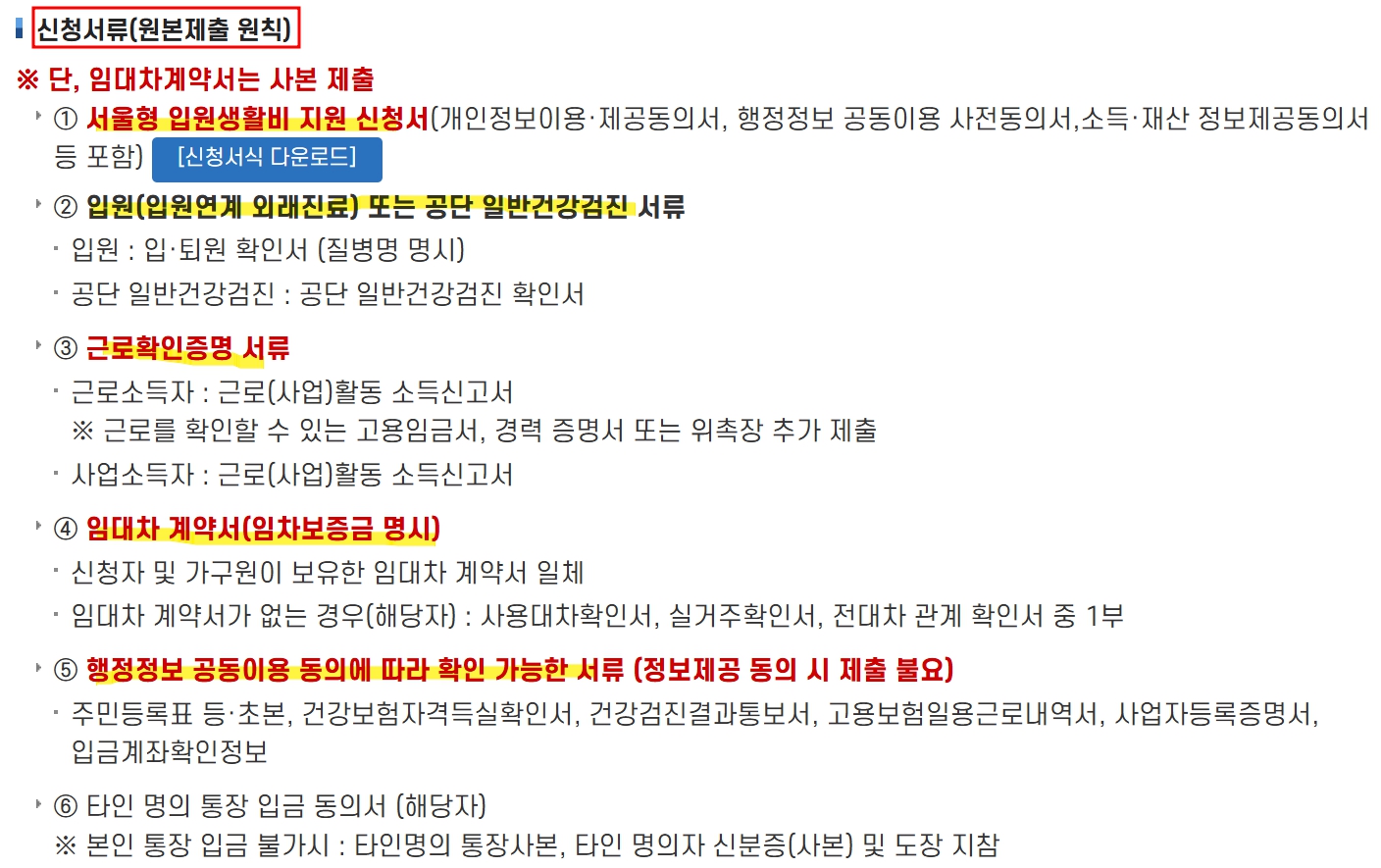 신청서류는 위와 같이 원본제출이 원칙이지만 임대차계약서는 사본을 제출합니다.
