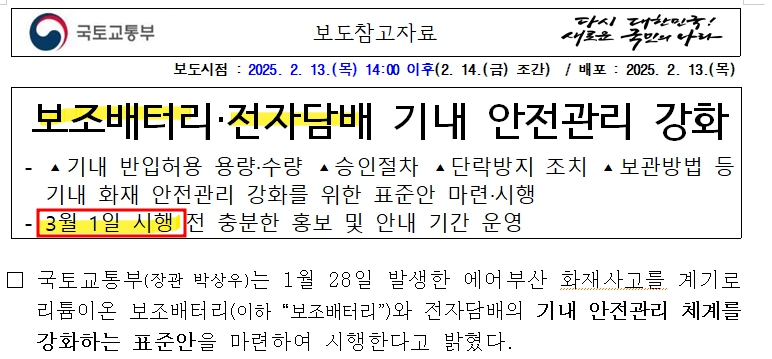 이는 국토교통부가 지난해 발생한 에어부산 화재사고를 계기로, 보조배터리와 전자담배가 기내 안전에 미치는 영향을 심각하게 고려하여 마련한 표준안에 따른 것입니다.