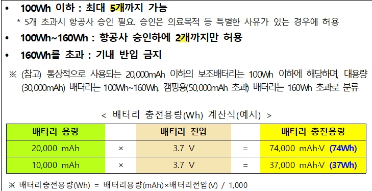 특히, 100Wh 이상 160Wh 이하의 보조배터리는 항공사의 승인을 받지 않으면 기내 반입이 불가능합니다.