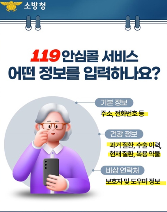 119안심콜 서비스에 등록하는 정보는 크게 기본 정보, 건강 정보, 그리고 비상 연락처로 나눌 수 있습니다.